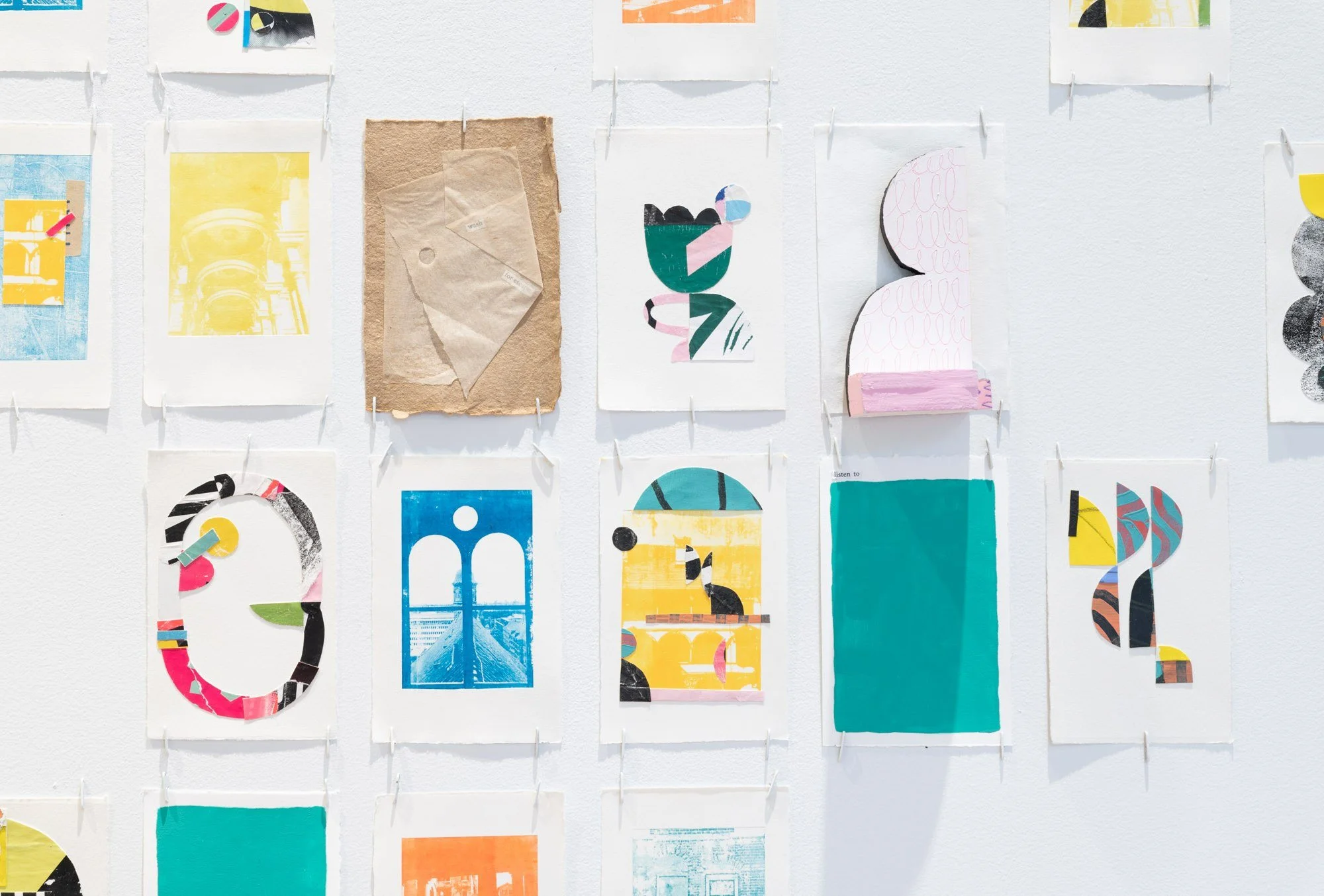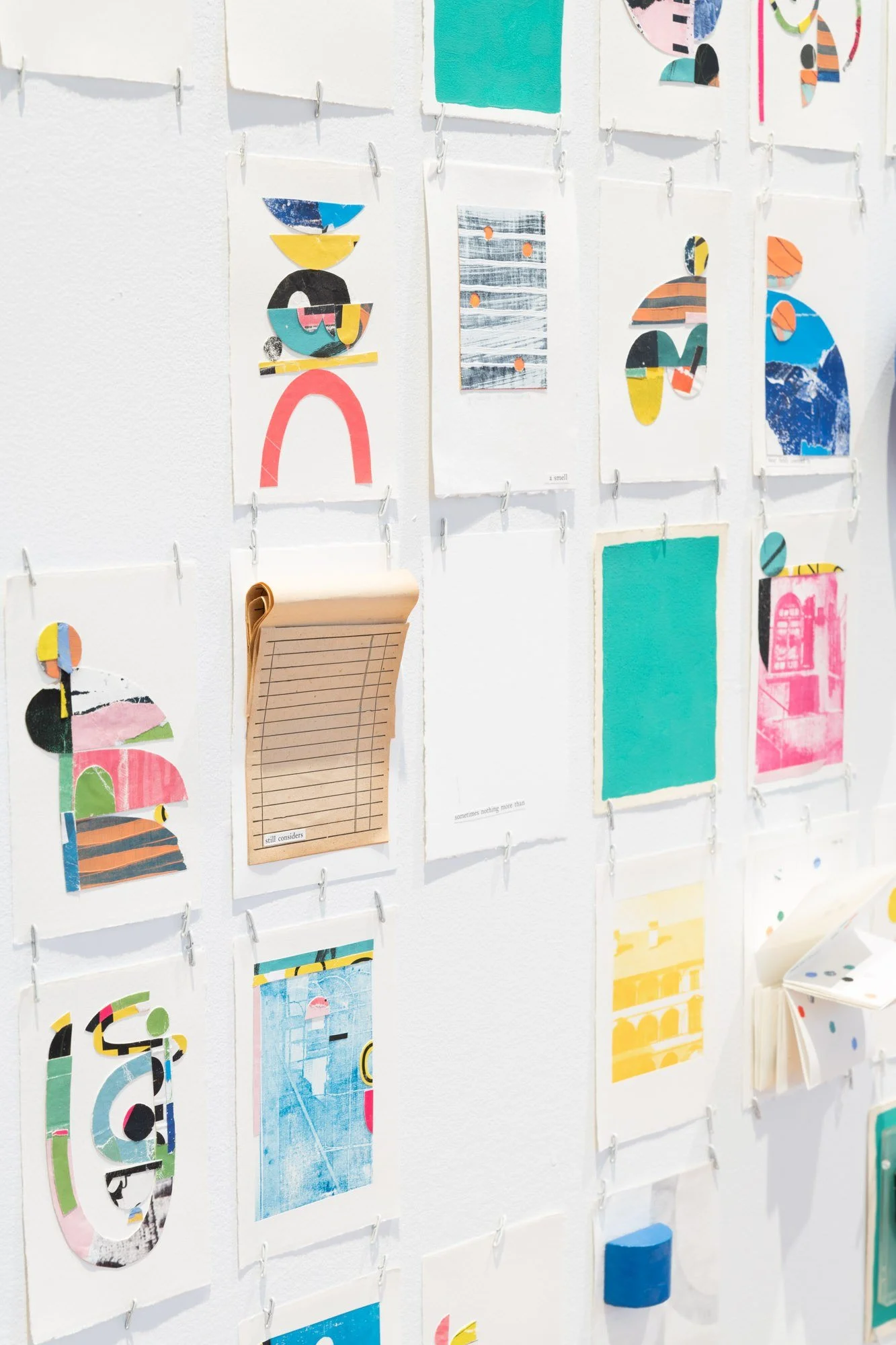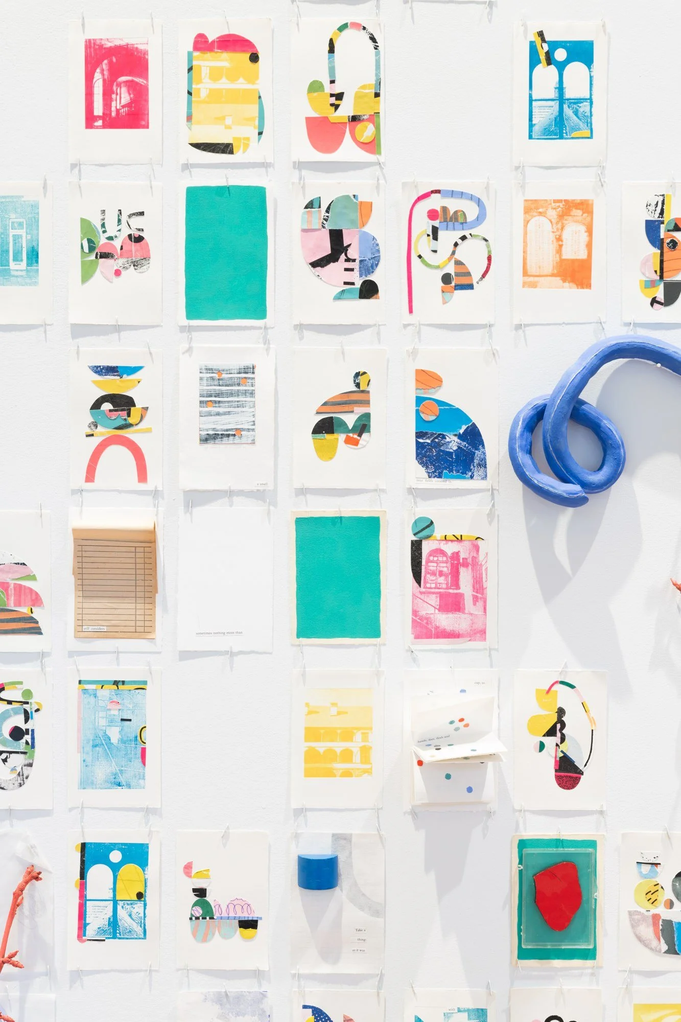 Sentences I Keep Near, is an ongoing installation of over one hundred 3” x 5” works on paper. Arranged together, they become a shifting archive; a time-traveling bibliography of shapes. Each collection of sentences reveal porous windows, possibilities, reminders, and souvenirs.