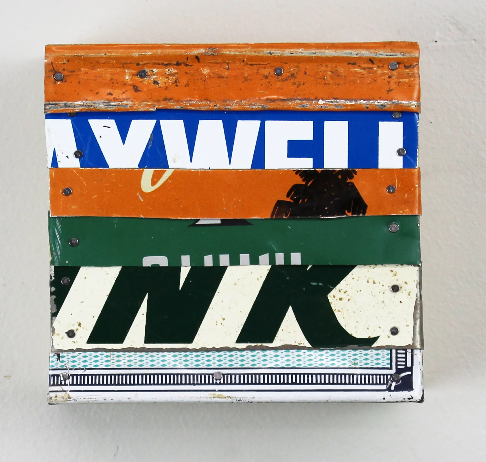 These miniatures explore the aesthetics of advertisements used to promote the everyday consumer object. This series of tin collages are created with repurposed retro advertisements and packaging of home goods; inspired by the color, type and graphics of bygone American consumerism culture. Marketed vices range from Jamaican rum to drip coffee to chewing tobacco and corn syrup with imitation maple flavor. Cut, rotated and nailed together these labels are reconfigured with trademarks of household necessities like Band-Aids and glue.